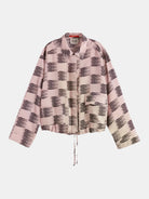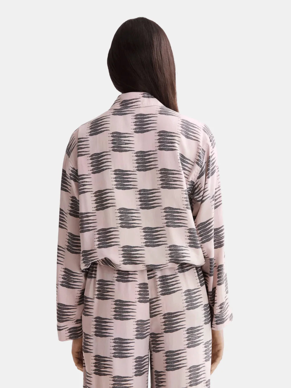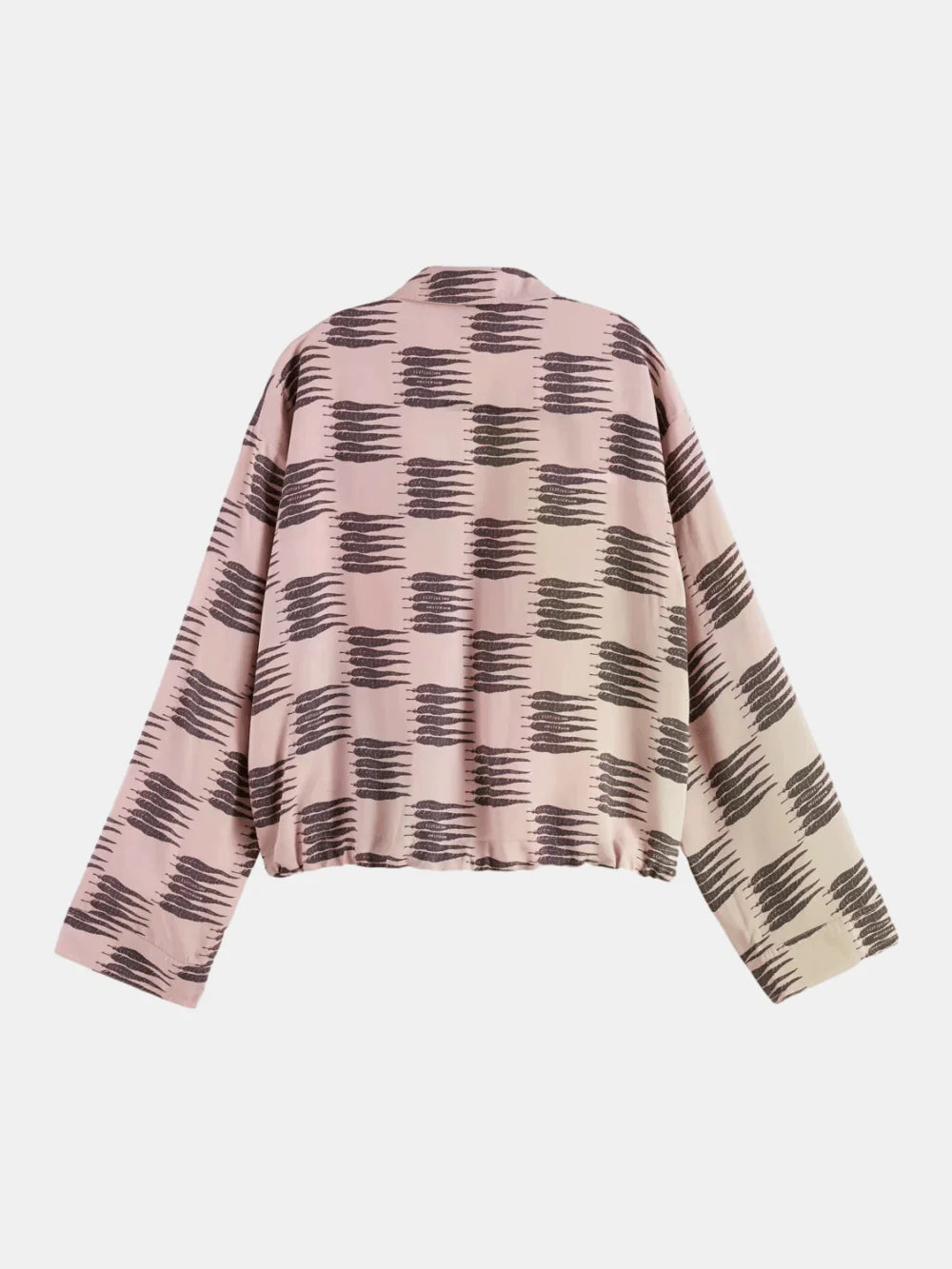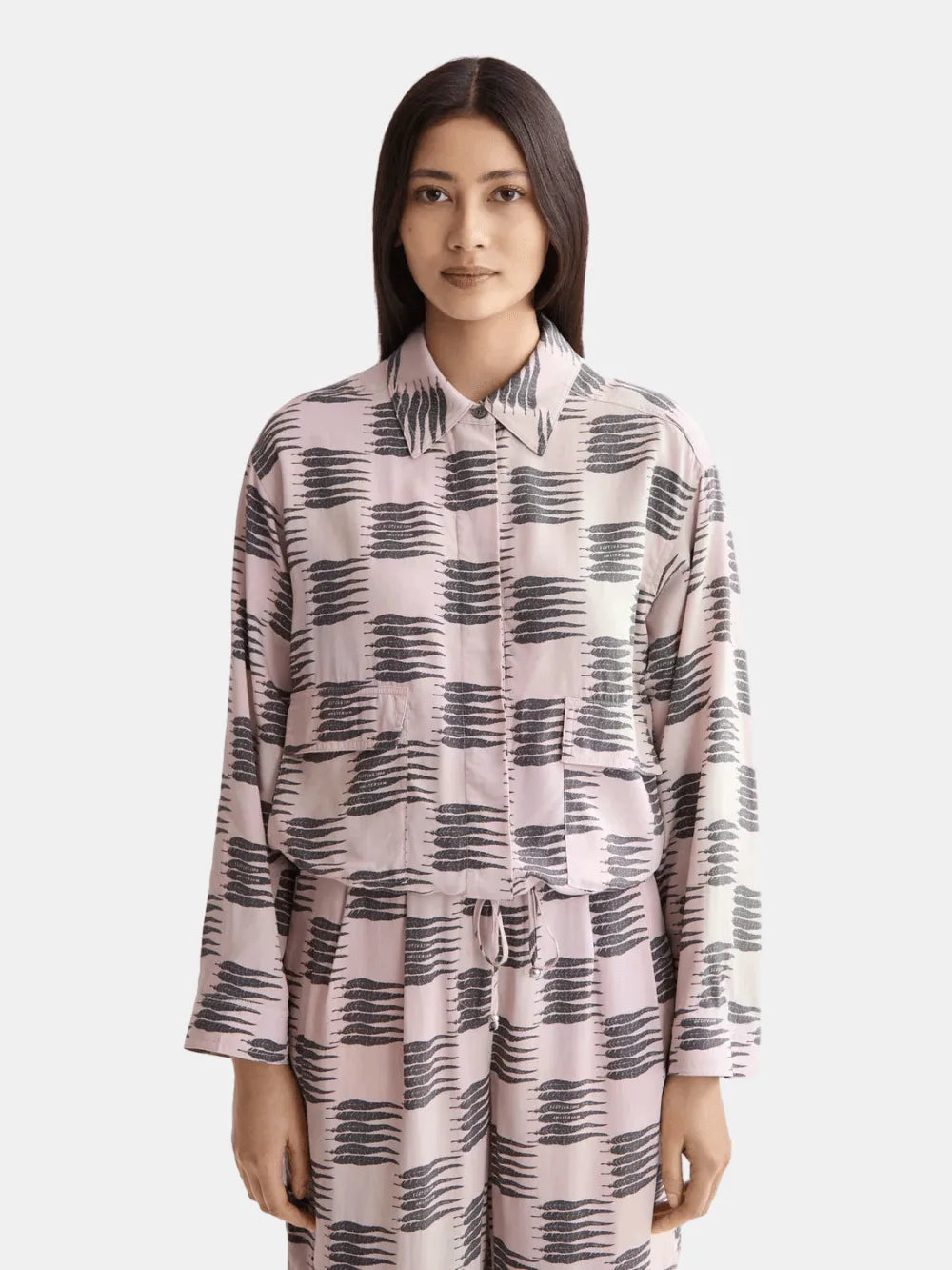 Stylish utility shirt with unique feather block print. Perfect blend of comfort and style for versatile everyday wear.