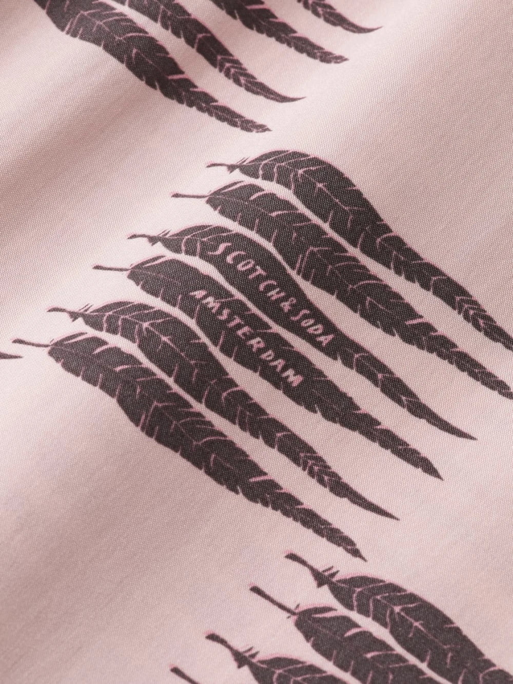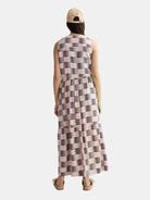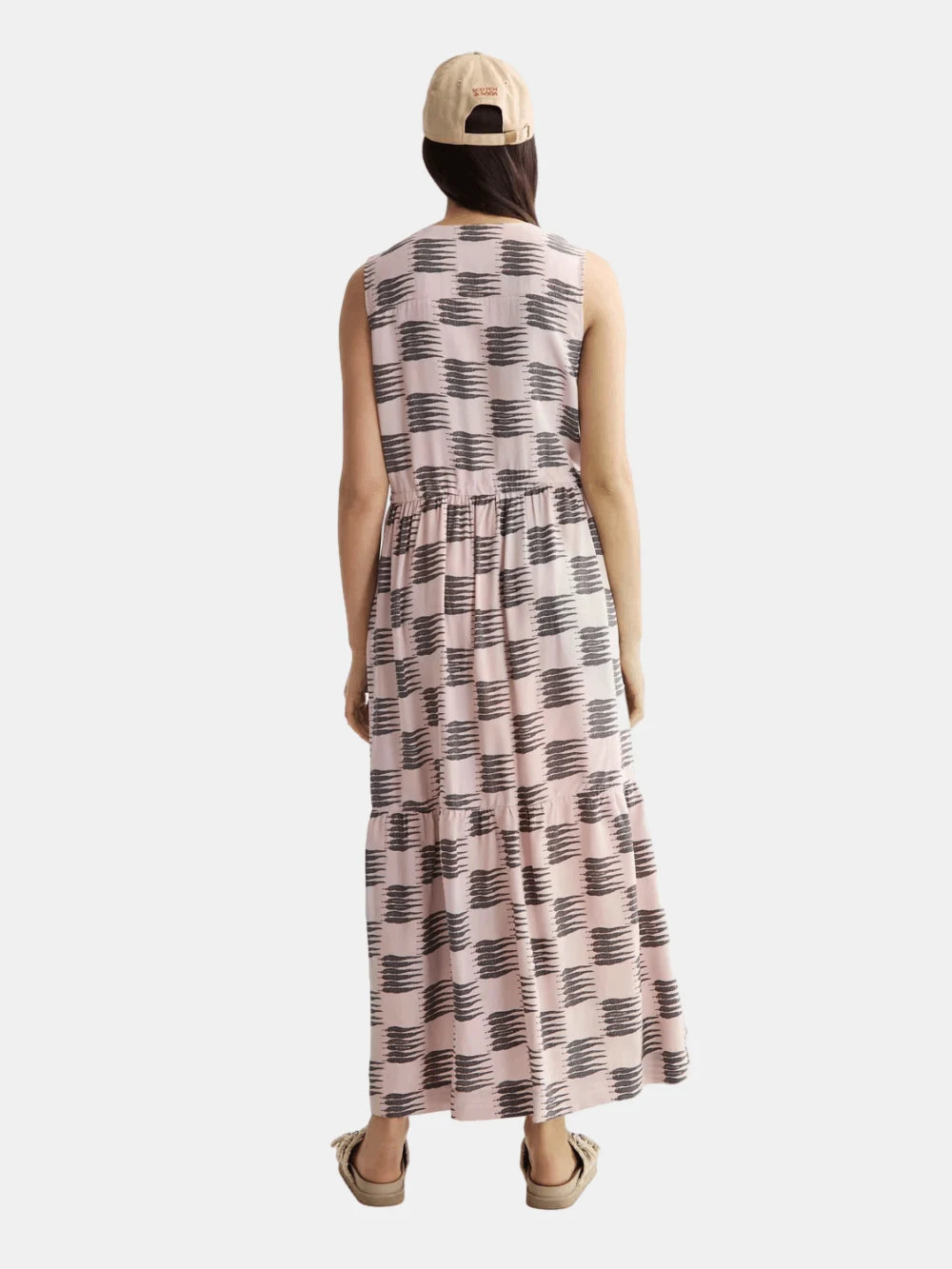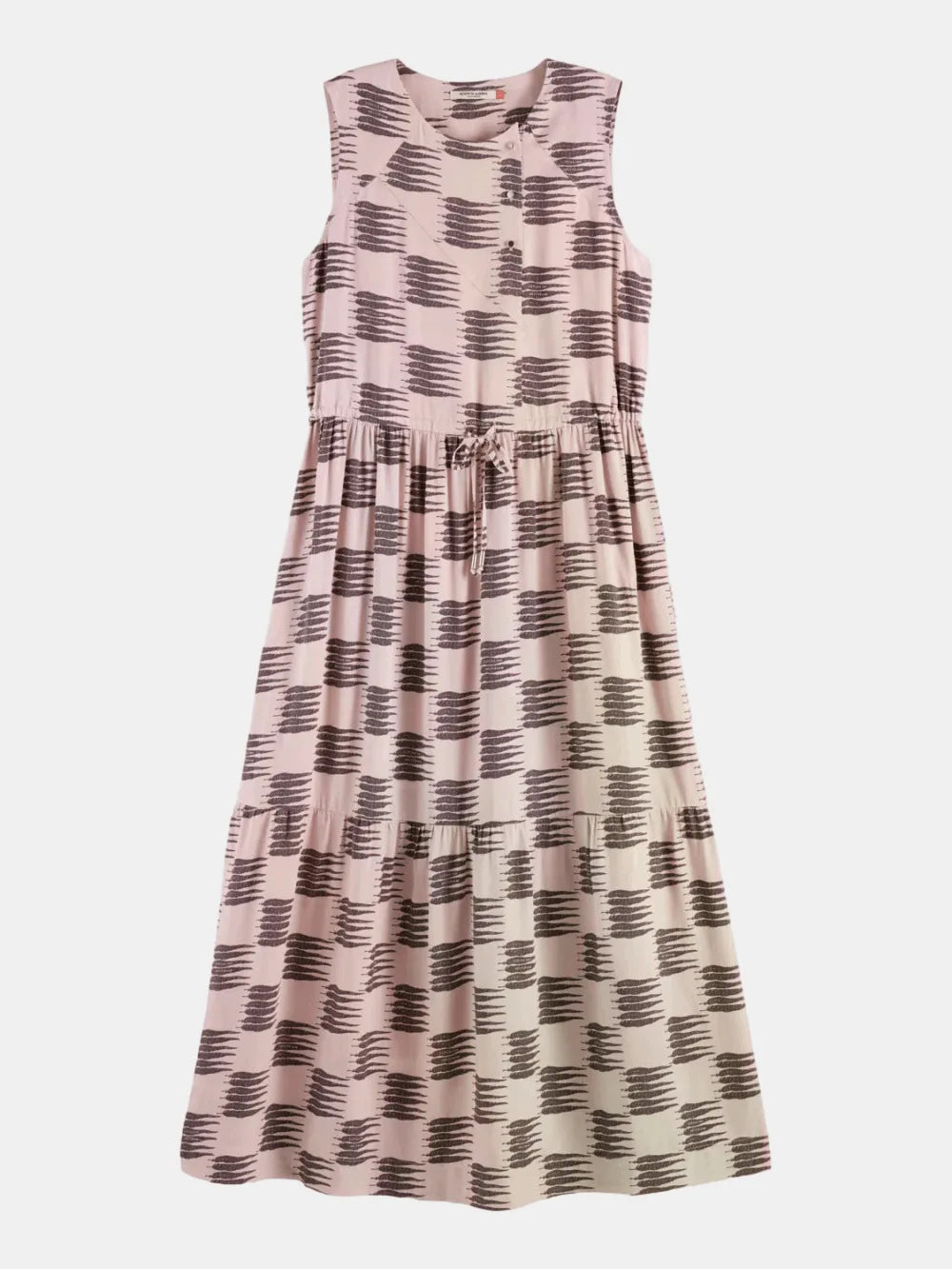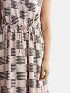 Elegant midi dress featuring a gathered waist and feather block design. Perfect for versatile styling and effortless chic.