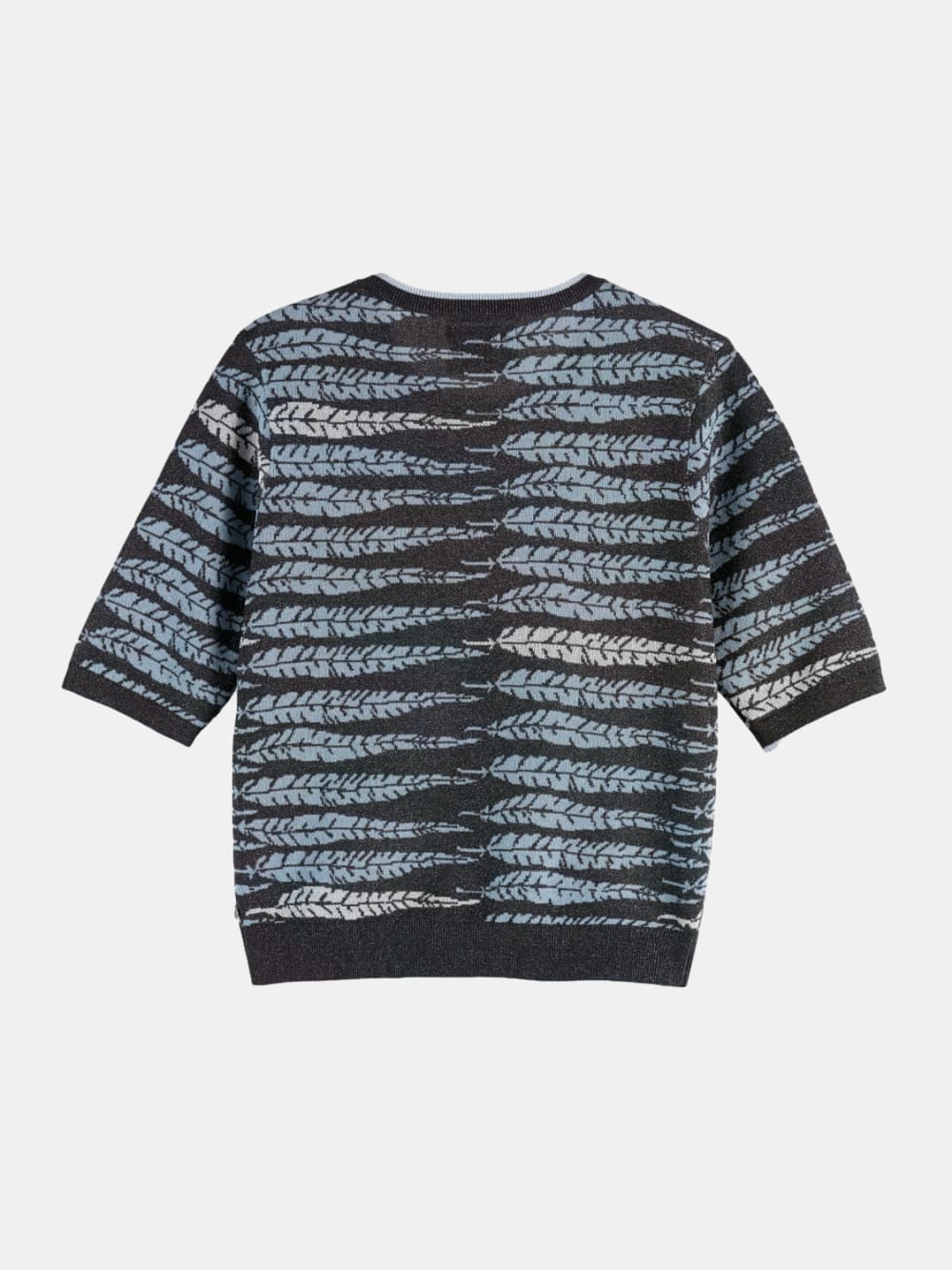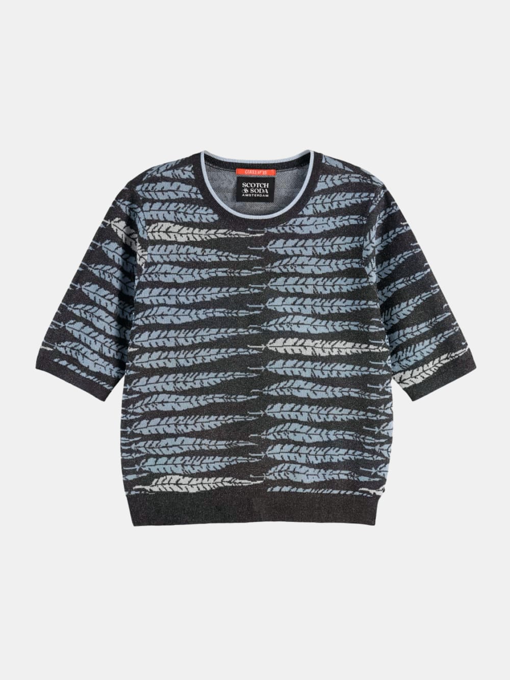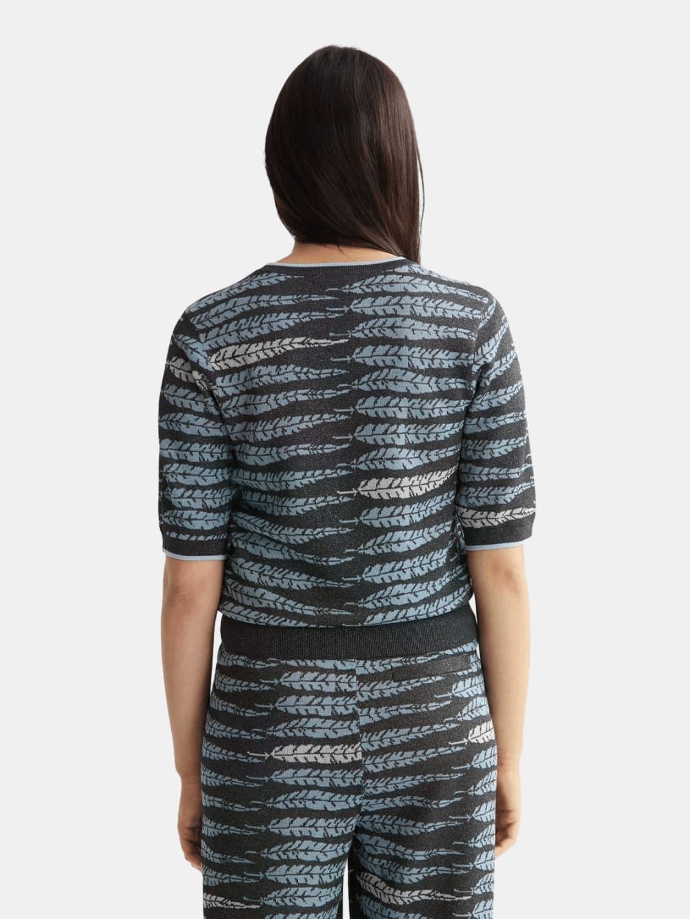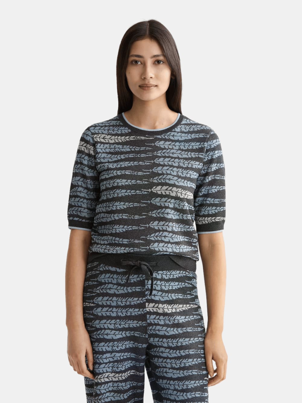 Stylish jacquard knit tee with shimmering lurex detail. Perfect for adding a touch of elegance to any outfit.