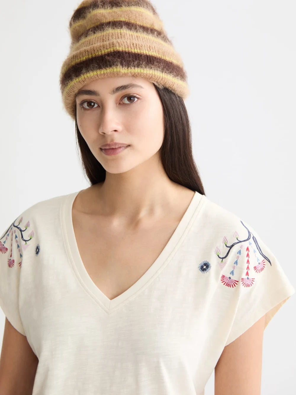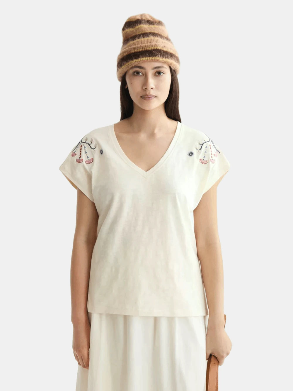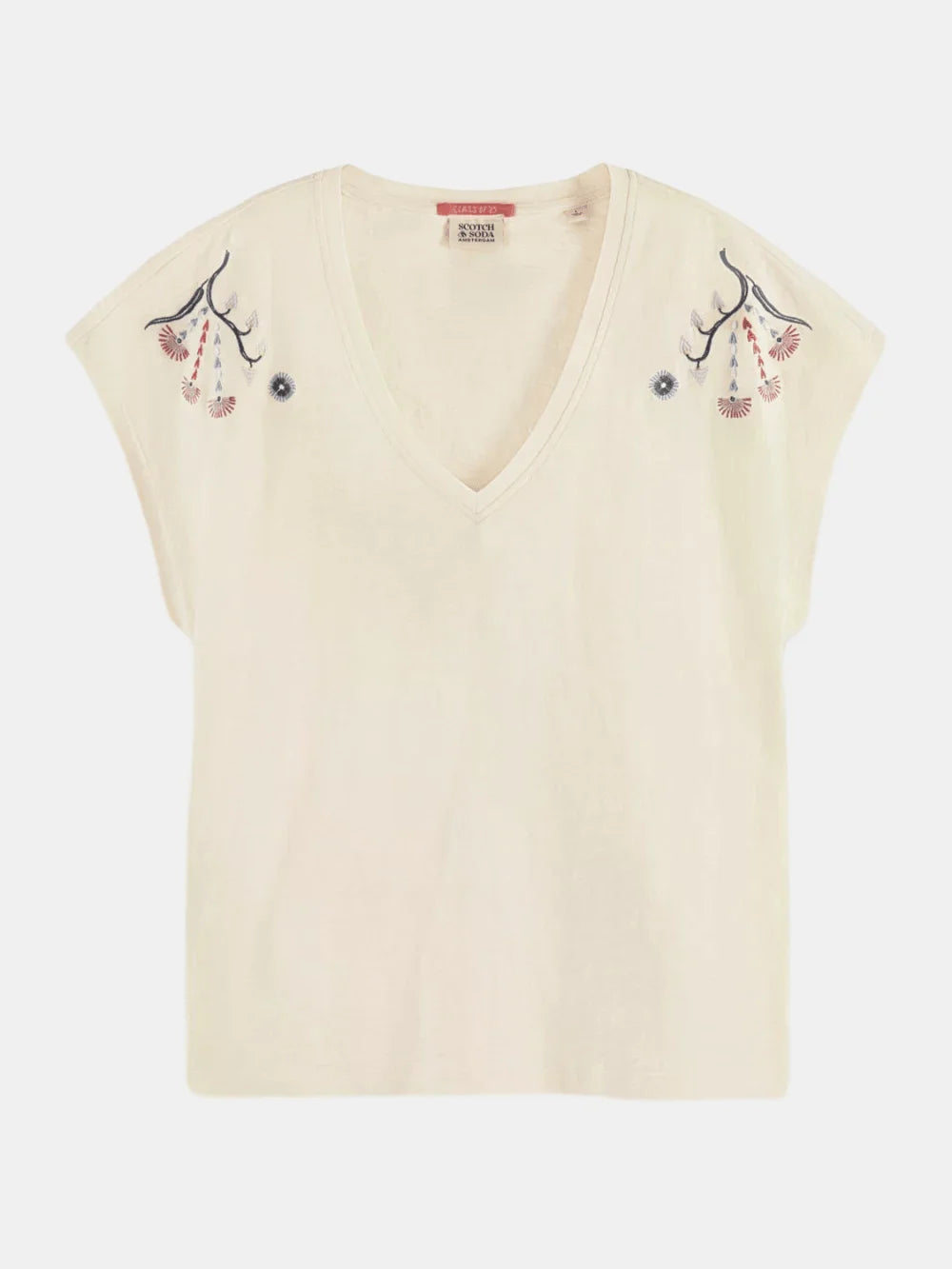 Stylish embroidered V-neck tee with soft fabric and relaxed fit, perfect for casual outings or layering with your favorite jacket.